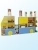 изготовлена из ЛДСП, торцы облицованы кромкой ПВХ 2 мм. Состоит из трех секций. 1 секция имитирует кабину и имеет 5 открытых ниш и одной ниши закрытой двумя дверями. 2 секция имеет три открытые ниши и две ниши закрытые дверями. 3 секция имеет две открытые ниши и нишу закрытую двумя дверями, завершают секцию 3 угловые полки. Нижние двери имеют изображения колес