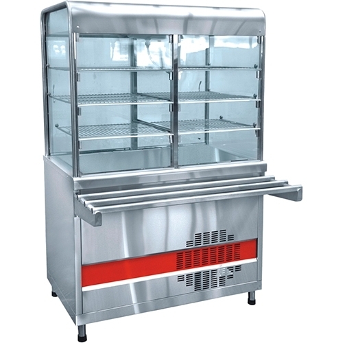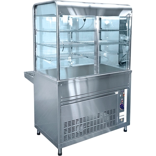Плавная регулировка температуры 1...10°С. Хладагент: R404A. Внутренний объем закрытой витрины имеет принудительную циркуляцию охлажденного воздуха и 6 ламп подсветки. Демонстрационная площадь ровной охлаждаемой столешницы 0,57 м², полкок: 1,55 м², полезный объем витрины 0,5 м³. Внизу - открытый нейтральный шкаф. Регулируемые по высоте ножки, полки и направляющие для подносов входят в комплект поставки.