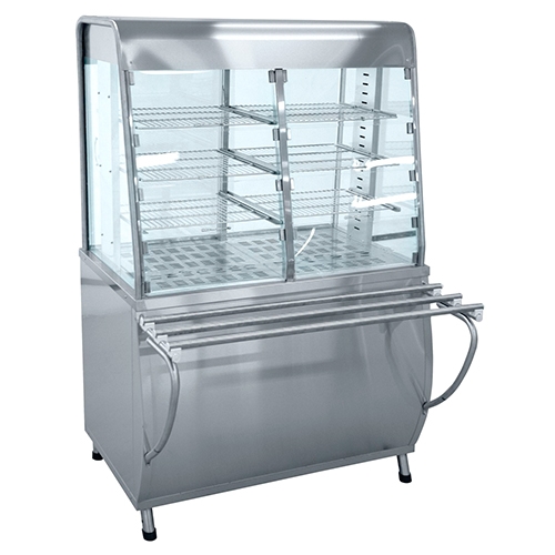 Диапазон регулирования температуры воздуха в витрине теплового прилавка 20...60°С, время разогрева до рабочей температуры: 40мин. Демонстрационная площадь: 1,34 м2. Витрина снабжена тремя ярусами полок-решеток, тремя лампами освещения и вентилятором, закрытым кожухом. Направляющие для подносов и регулируемые по высоте ножки входят в комплект поставки.