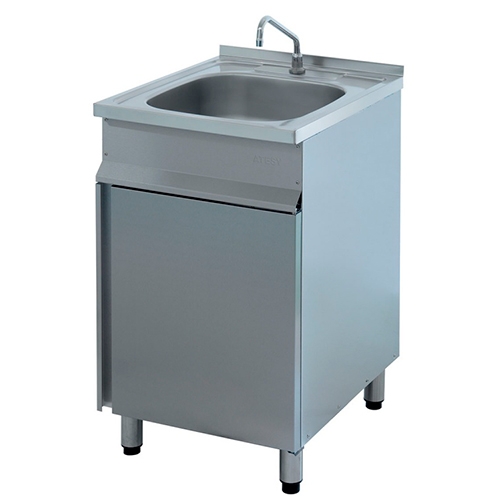 Ванна цельнотянутая с бортиком, выполнена из нержавеющей стали марки AISI 304 толщиной 0,8 мм и имеет разборный каркас. Внутренний размер ванны – 390х420х150 мм. Боковые стенки и передняя распашная дверца выполнены из нержавеющей стали марки AISI 430. Задняя стенка выполнена из оцинкованной стали толщиной 1,2 мм и имеет два отверстия для подводки воды. Без педали.