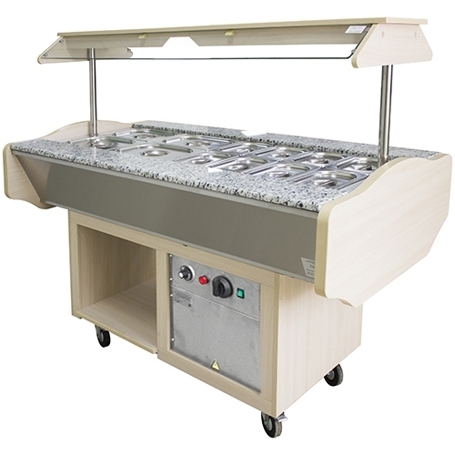 Каркас мармита МЭП-2Б-ШС-Г изготовлен из профильной окрашенной трубы и имеет декоративную облицовку. В каркас встроена прямоугольная ванна с электронагревателями и имеет гнезда для установки гастроемкостей. Над тумбой установлена полка для тарелок, а внутри тумбы полка для инвентаря. Столешница выполнена из гранита. На панели управления установлен переключатель температурного режима(1-низкая температура, 2-средняя температура, 3-высокая температура) датчик - реле температуры и сигнальная лампа. В комплекте 12 гастроемкостей. Стол оснащен колесиками. Поставляется в собранном виде.