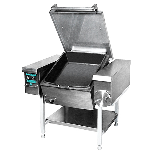 Температура нагрева регулируется в диапазоне от 100 до 300 °С. Разогрев до рабочей температуры (280°С) за 30 мин. Оснащена аварийным предохранителем от перегрева свыше 350 С. Внутренние размеры чаши: дно 550х460мм, верх 580х510х140мм. Передняя облицовка, крышка и каркас сковороды выполнены из нержавеющей стали. Чаша выполнена из чугуна. Оснащается механизмом подъема и опускания чаши с помощью вращающейся рукоятки и регулируемыми по высоте ножками.