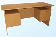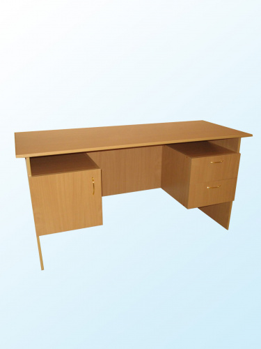 поставщик ЭМС - изготовлен из ЛДСП, торцы облицованы кромкой ПВХ 0,4 мм, столешница облицована кромкой ПВХ 2 мм. С одной стороны стол имеет 2 ящика на роликовых направляющих и открытую нишу, с другой стороны - тумбу с полкой и открытую нишу. На панелях ящиков и на двери установлены ручки-скобы металлические